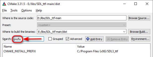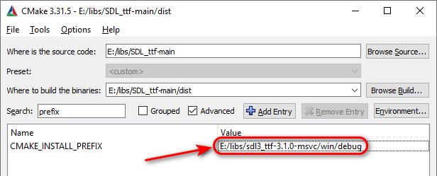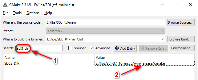 Type sdl3_dir in the "Search" field and set a path to the SDL3 "debug/cmake" folder where SDL3 was installed: