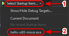 Click on the "Select Startup Item" and select "hello-sdl3-mixer.exe":